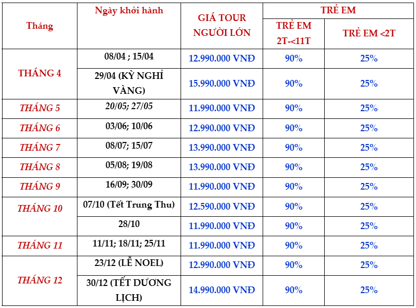 Trẻ từ 2 - dưới 11 tuổi: Giá 90% so với giá tour người lớn, ngủ chung với bố mẹ