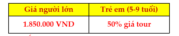 Từ 10 tuổi trở lên tính giá tour như người lớn. Trẻ em chiếm tối đa 15% số lượng người lớn. Nếu vượt quá sẽ phụ thu giá tour.