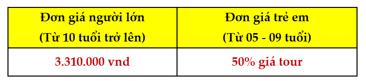 (Áp dụng cho đoàn từ 40 người trở lên)*Giá trên không áp dụng vào các ngày Lễ Tết, cuối tuần GIÁ TOUR BAO GỒM: