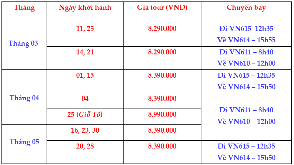 ** Với các ngày khởi hành theo chuyến bay VN615 lúc 12h35 (Ăn Trưa MB, Ăn Tối)
