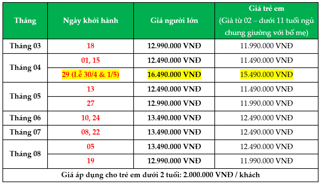 Chi phí trên áp dụng cho khách mang hộ chiếu Việt Nam (hộ chiếu còn hạn ít nhất 6 tháng tính từ ngày kết thúc tour). Khách mang hộ chiếu nước ngoài vui lòng kiểm tra lại các điều kiện liên quan.